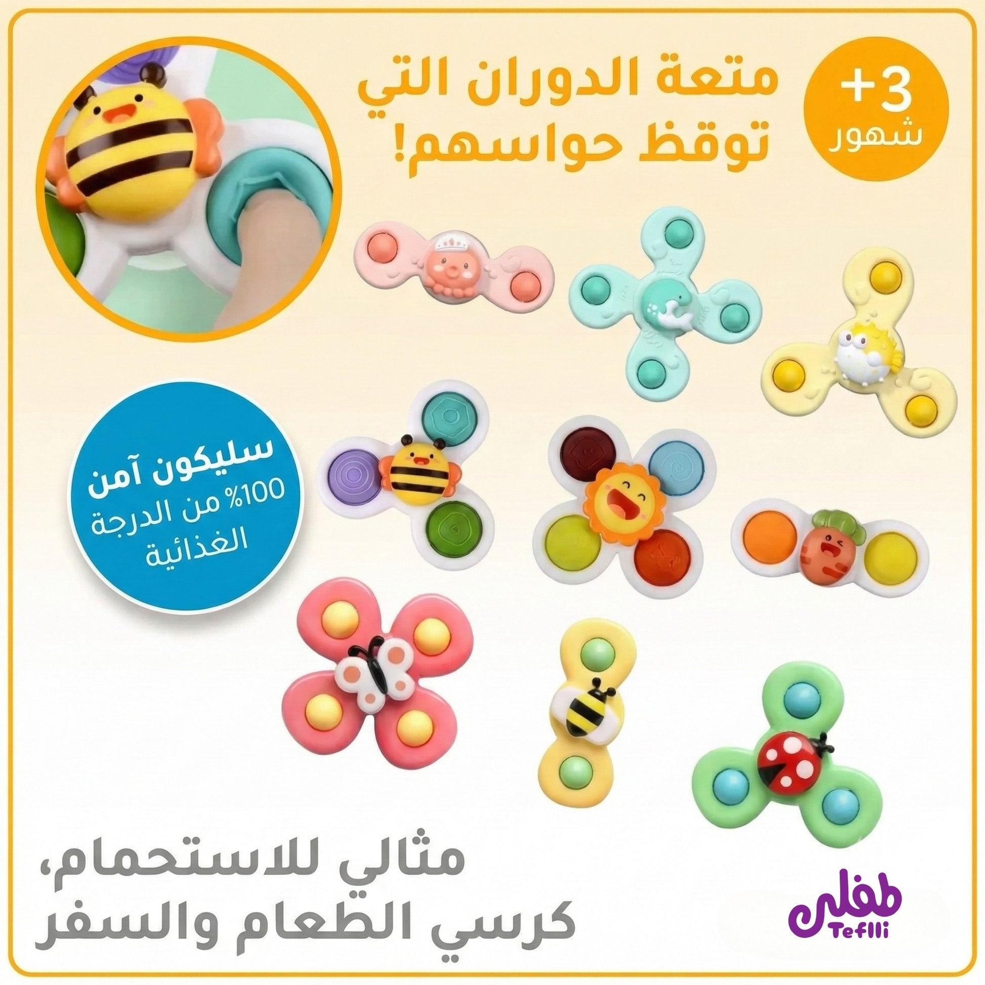 حوّل الروتين اليومي إلى لحظات ممتعة مليانة اكتشاف وتعلّم. سبينر الأطفال من طفلي مصمّم ليشغل فضول طفلك سواء وهو على كرسي الأكل، في البانيو، أو حتى وهو يتفرّج على الشباك.
